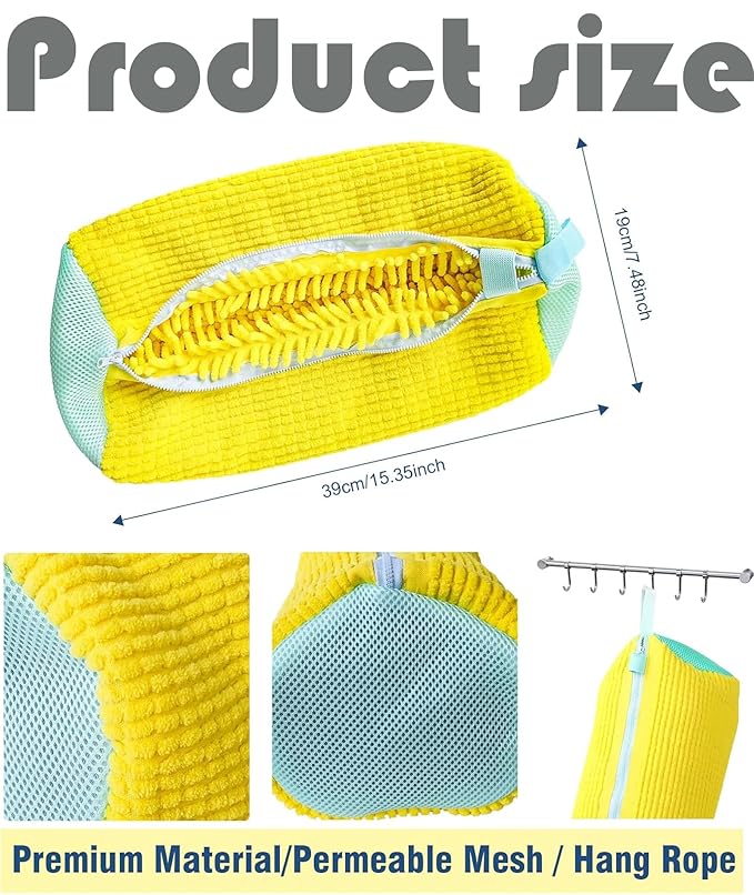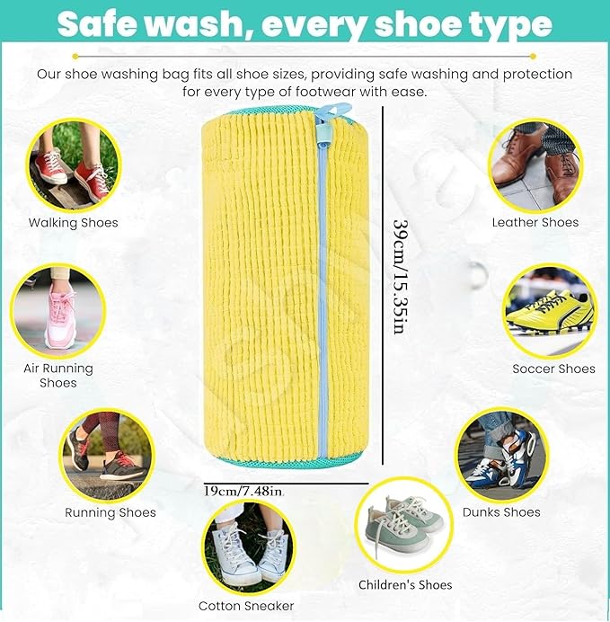 - 【Increase Size, Fits All Shoes The improved shoe cleaning bag is larger, measuring 15 inch in length and 7.1 inch in diameter, offering more space than most shoe bags on the market. In most cases, one shoe washing bag can hold 1 pair of shoes, but if you want to give each shoe a thorough cleaning, you can also place each shoe in a separate shoe washing bag; This shoe washing bag is suitable for all types of shoes, including men's sneakers, women's shoes, children's shoes, and casual shoes.