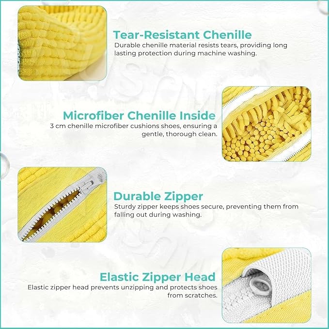 - 【Upgrade 20000+Fluffy Fibers & Sandwich Mesh This shoe washing bag is made of a composite structure fabric of sandwich mesh and 20000+ fluffy fibers. The chenille fabric has a weight of 1450gsm, a color fastness of grade 3 or above, and the pile column is thickened and lengthened to 1.2 inch, which have much better cleaning effect than only mesh fabric. The top and bottom are made of sandwich mesh fabric, so the soap water can easily flow through the mesh, achieving the best cleaning effect.