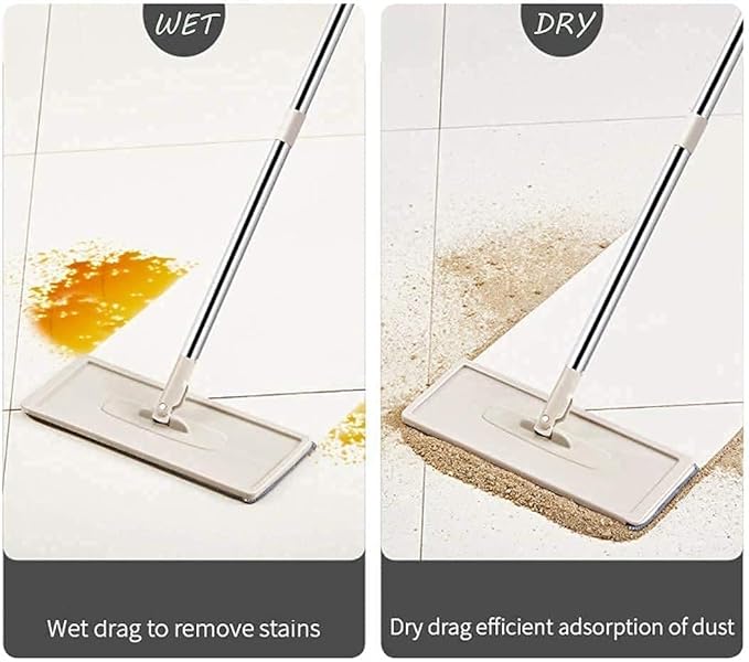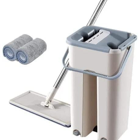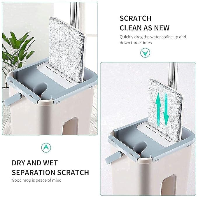 - Quick Wash And Dry Mop Two chamber buckets: one wet bucket and one dry bucket (the bucket with scraper) makes mopping easier and faster. Unique effortless one hand operated wringer system removes dirt and water from the mop without the need spinning or squeezing! Install the mop pad correctly and press tightly, the mop panel will be easily pushed into the drying side bucket to squeeze out the water.